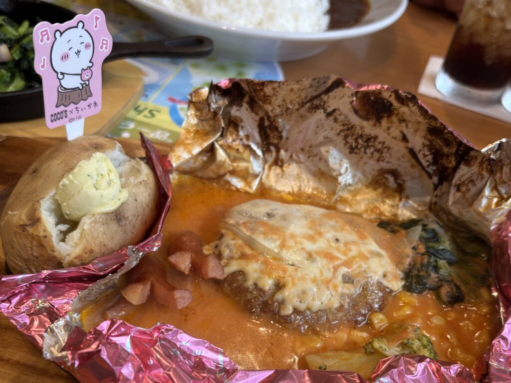 私が頼んだのは「ちいかわのトマトクリーム包み焼きハンバーグ」、夫は「ココスのビーフカレー」を注文✨️
