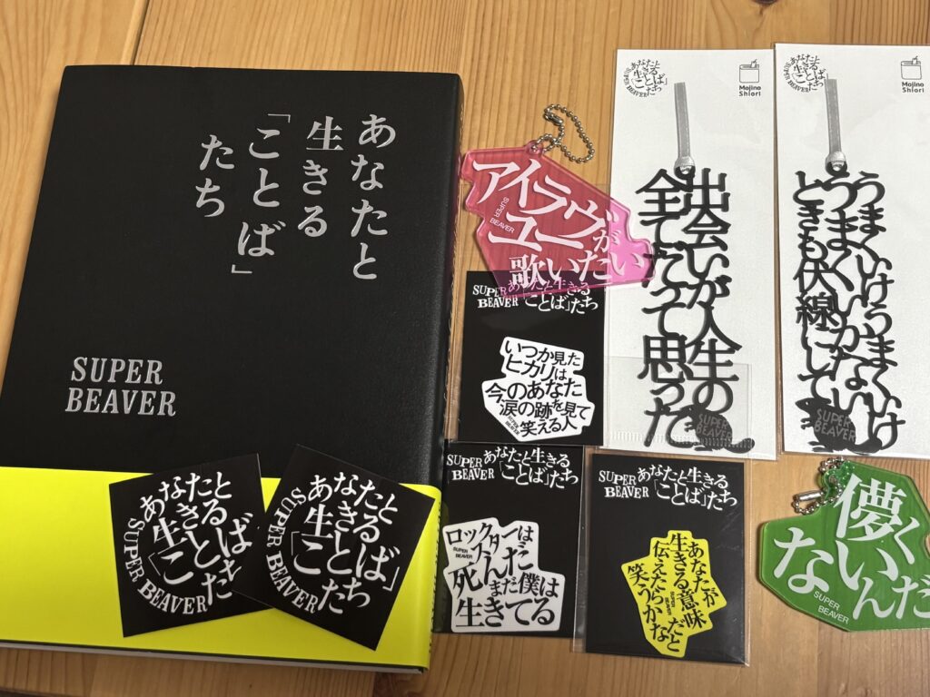 グッズは書籍をはじめ、歌詞のしおり・ステッカー・歌詞入りランダムアクリルキーホルダーなどなど!
